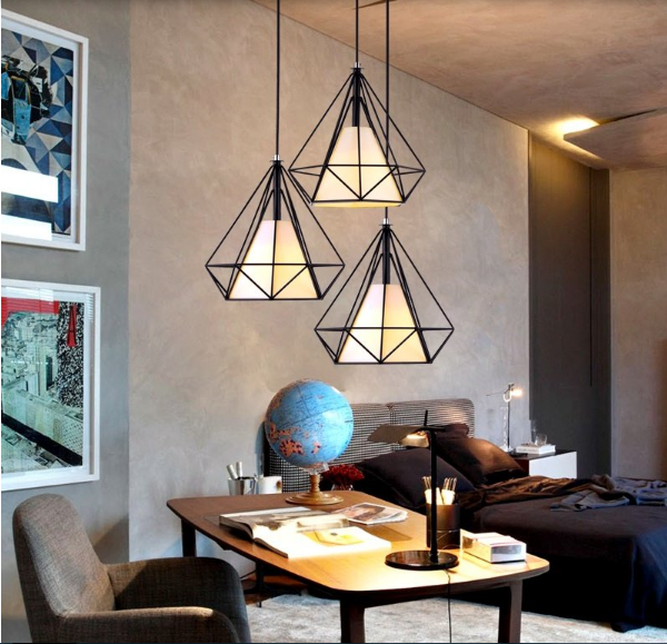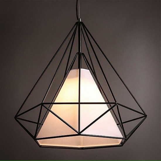 Chao đèn thả lồng kim cương, nghệ thuật bên ngoài dạng như 1 viên kim cương khung bằng các thanh sắt đan vào nhau dạng lưới bảo vệ bóng đèn đui E27 làm nguồn sáng của đèn thả xuống phía dưới.