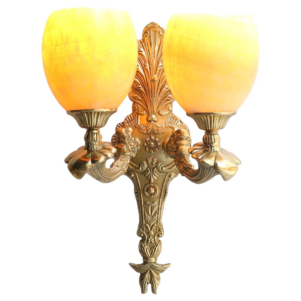 Đèn được chế tạo từ công nghệ đồng đúc nguyên khối với các hoa văn tỉ mỉ, đậm dáng vẻ cổ điển. Đặc biệt, chao đèn sử dụng đá tự nhiên có màu sắc và vân đá đẹp mắt. Tuy lớp đá dày nhưng vẫn có độ trong nhất định, cho phép ánh sáng truyền qua giống như đá ngọc. Sang trọng, cao cấp, cổ điển là những ấn tượng về chiếc đèn này.